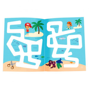 Elk koffertje bevat 3 boekjes, gebonden met draad, dus geen gevaarlijke scherpe nietjes, voorzien van geplastificeerde bladzijden met daarop verschillende uit te voeren activiteiten (getallen, doolhoven en overeenkomsten). In het koffertje zit ook een zwarte marker met wisser, die het mogelijk maakt om gedane activiteiten te verwijderen en de pagina’s / activiteit opnieuw te maken.