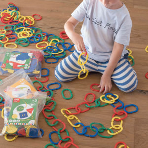 Schakelringen van APLI Kids. Maak de gekleurde ringen aan elkaar vast, in een kleurpatroon of gewoon willekeurig. Schakelringen verbeteren de fijne motoriek, kleur herkenning en de oog-hand coördinatie.