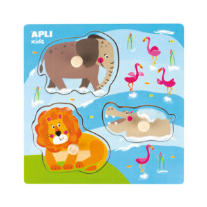 Houten knopjespuzzel met als thema jungle dieren. De puzzel is in kleur gedrukt en bevat een gedrukte afbeelding op het puzzelbord om het puzzelen te vergemakkelijken. Het doel van het spel is om elke vorm op zijn plaats te differentiëren, te identificeren en in elkaar te passen. Een spel met een hoge didactische waarde: Het oppakken van elk stukje oefeningen met duim en wijsvinger, helpt bij het leren onderscheiden van vormen en het ontwikkelen van logica en visueel-ruimtelijke vaardigheden.