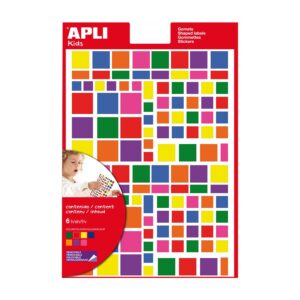 Zakje met verschillende verwijderbare educatieve stickers, in verschillende kleuren: groen, oranje, roze, blauw, rood, lila en geel. Verschillende maten en vormen. Elk zakje bevat 6 vellen met verschillende maten: 9 x 9 mm, 11 x 11 mm, 16 x 16 mm, 20 x 20 mm en 16 x 8 mm. In totaal 732 stickers. stickers. Bovendien voldoen de APLI stickers aan de strengste kwaliteits- en veiligheidsvoorschriften: – Gefabriceerd in overeenstemming met de normen EN-71 en de FSC chain of custody – Lijm op waterbasis – Vrij van oplosmiddelen – ECF (Elemental Chlorine Free) papier – 100% recyclebaar materiaal