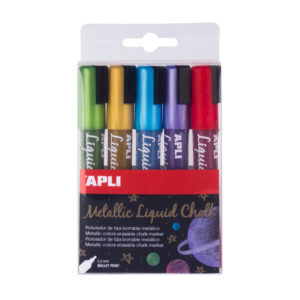 Verpakking met 5 vloeibare krijtstiften met een ronde 5,5 mm punt in verschillende metallic kleuren: geel, blauw, paars, rood en groen. Ideaal om te schrijven op schoolborden, plastic, ramen, leisteenetiketten, glanzende borden, spiegels, keramiek, vinyl, metaal, enz. Gemakkelijk te wissen met een vochtige doek op niet-poreuze oppervlakken. Praktisch en gemakkelijk te gebruiken in uw bedrijf, kantoor, thuis of op school. Snelle droging voor een meer precieze en professionele afwerking. Eenvoudig te gebruiken: Schudden, openen en gebruiken. Markeerstift op waterbasis, vrij van giftige elementen.