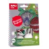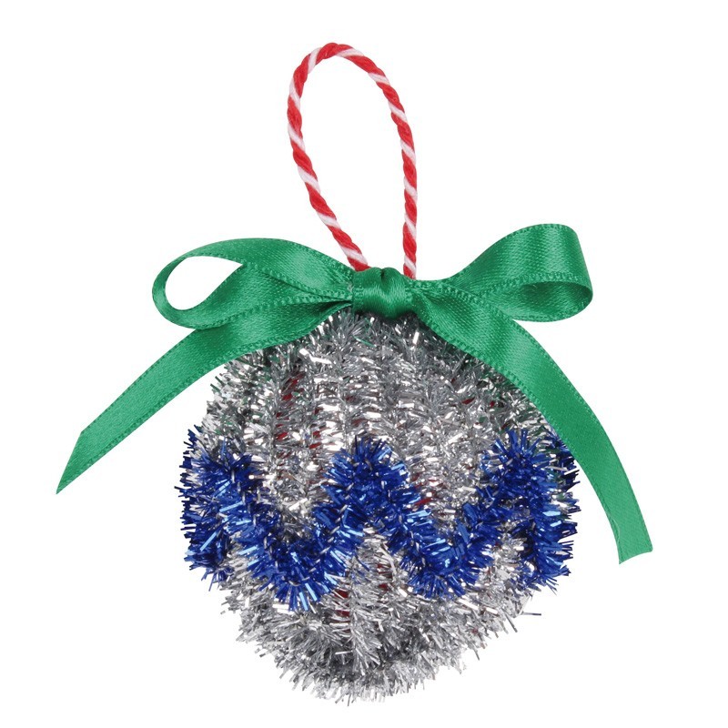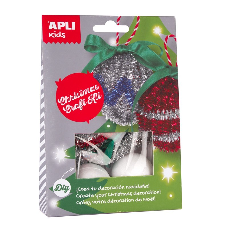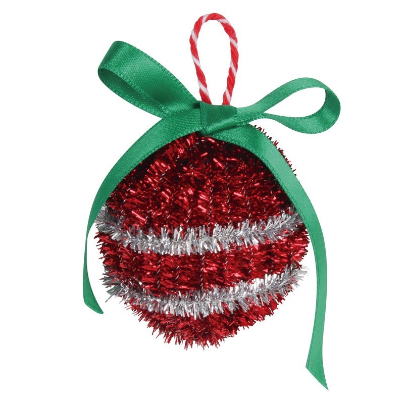 2 piepschuimballen met metallic slingers, gekleurd lint en ophanghaakjes, om zelf 2 kerstballen te maken.