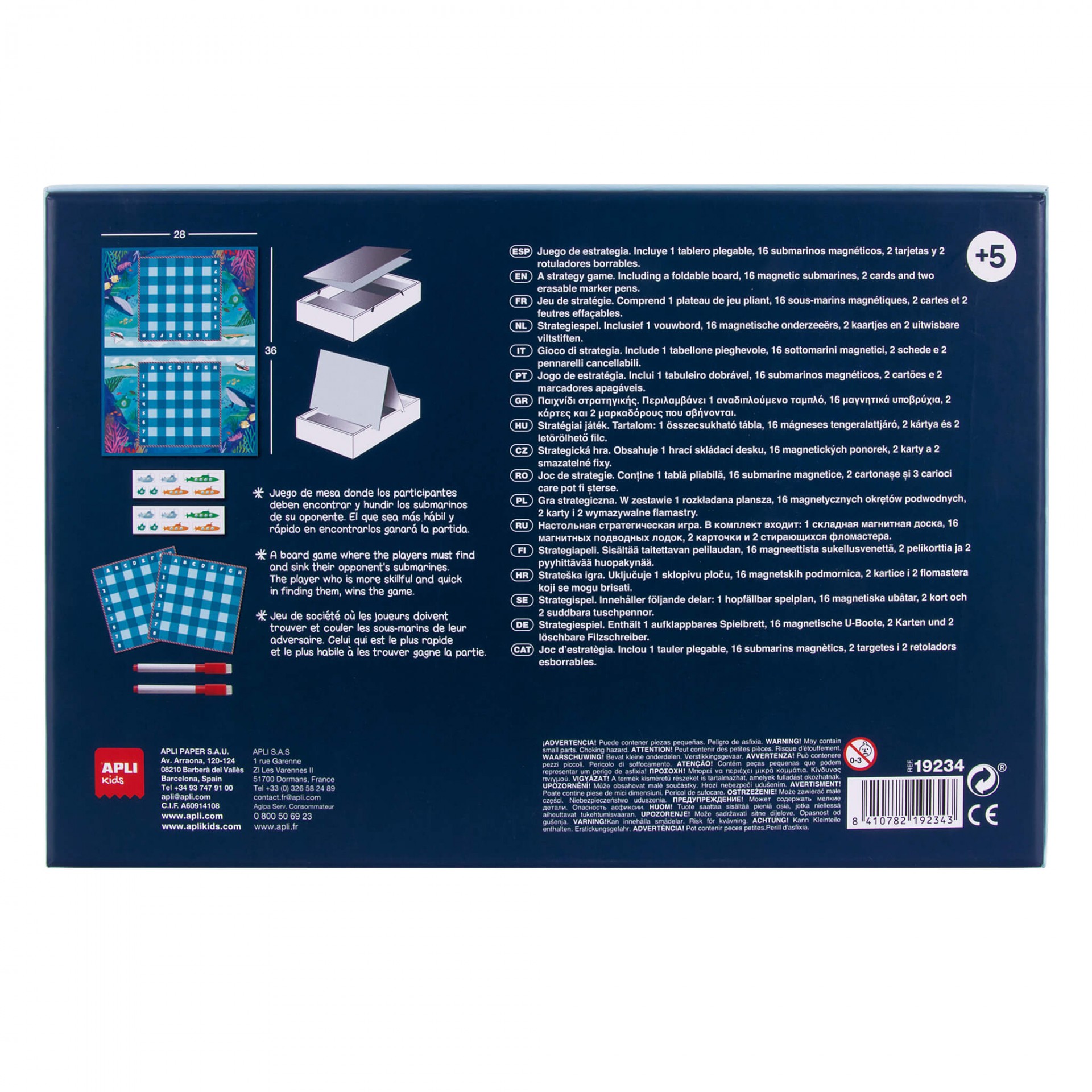 Het spel bevat: 1 bord van 28 x 36,5 cm dat in de bodem van de doos past, 16 magnetische onderzeeërs, 2 kaarten en 2 uitwisbare stiften.