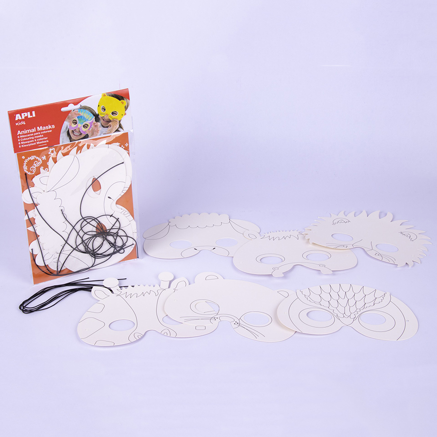 Maskers gemaakt van 360 g/m² karton, bedrukt met dierenvormen om te kleuren en te versieren. Elk pakje bevat 6 verschillende maskers: schaap, nijlpaard, uil, giraf, kat en leeuw. Inclusief elastiek. Ideaal voor kinderfeestjes, scholen, kinderworkshops, verkleedpartijtjes, enz. Kan ingekleurd worden met stift, potlood, kleurpotloden… of versierd met stickers, EVA-schuim, vilt, pompons, veren, enz.