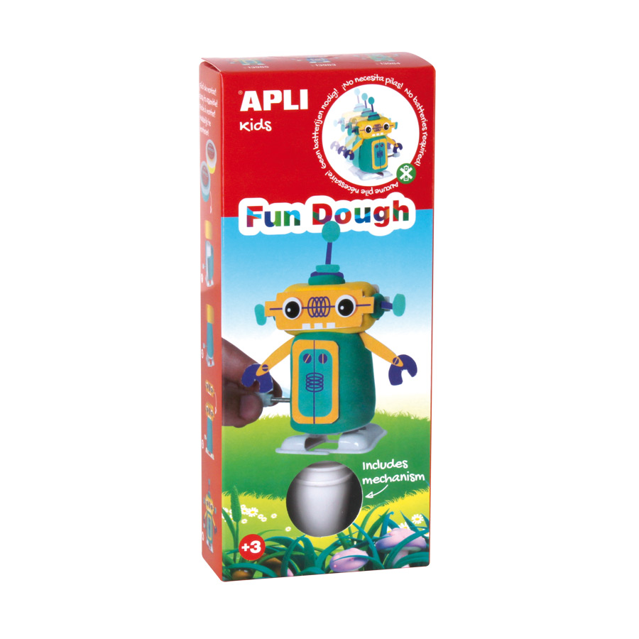 Robot knutselpakket. De robot dient te worden gebouwd met de 2 bijgeleverde potjes Fun Dough (boetseerpasta) en de te worden bevestigd op het opwindmechanisme. Samen met de onderdelen van karton vormen ze samen de robot. Als de robot klaar is, wind hem op en hij loopt automatisch.