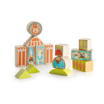 Spel met stapelbare houten blokken voorzien van circus thema. Elke verpakking bevat 15 houten blokken en een stoffen zak met een koord om ze in te bewaren. Blokken van hoogwaardig grenenhout, met afgeronde hoeken en kleurendruk aan beide zijden.