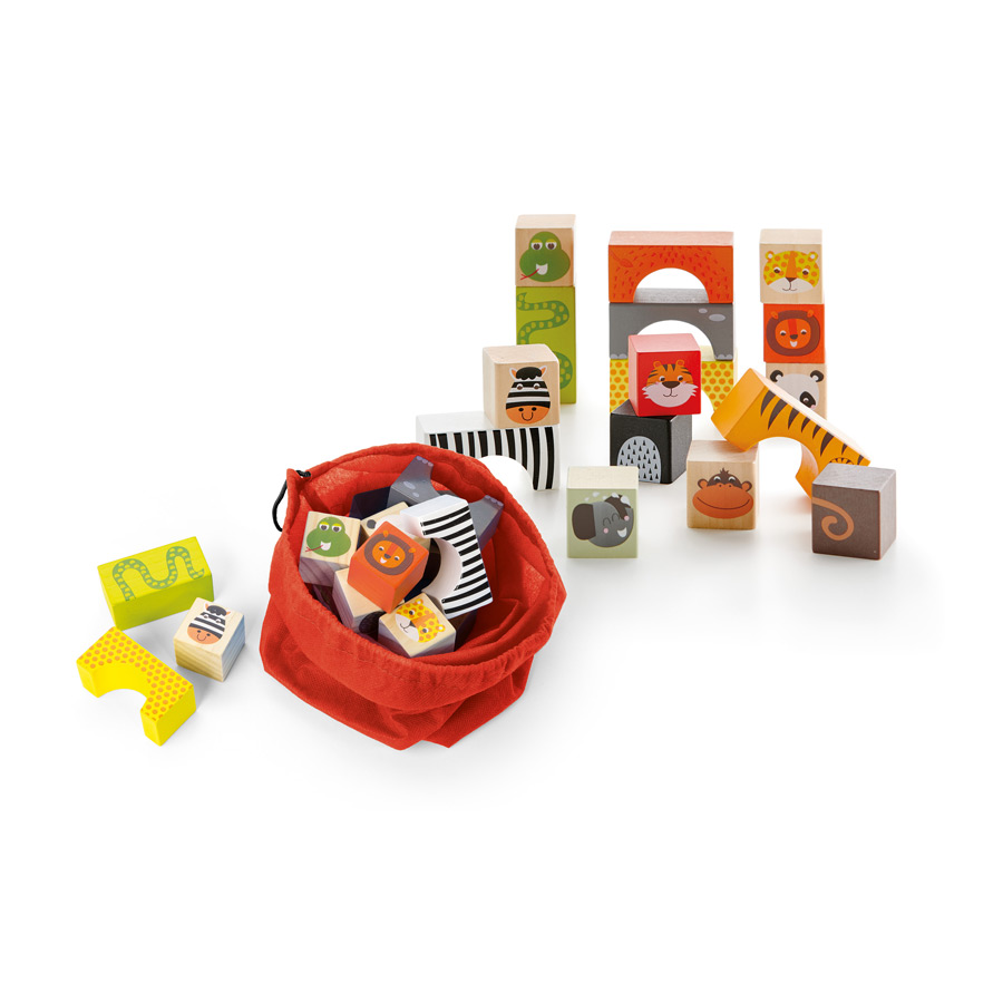 Spel met stapelbare houten blokken voorzien van jungle thema. Elke verpakking bevat 15 houten blokken en een stoffen zak met een koord om ze in te bewaren. Blokken van hoogwaardig grenenhout, met afgeronde hoeken en kleurendruk aan beide zijden.