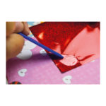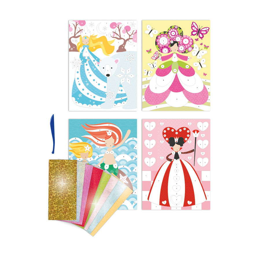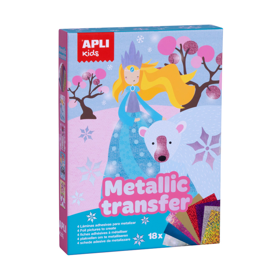 Een spel met zelfklevende films om verrassende kleurplaten te maken met overdraagbaar metaalpapier. Het doel van het spel is om de tekeningen van de kaarten in te kleuren met de vellen transferpapier. Til de zelfklevende delen van de kaarten op met het plastic gereedschap en vul ze in met het metallic papier van de juiste kleur. Het spel omvat: 4 geïllustreerde vellen met zelfklevend voorgesneden folie, 18 vellen overdraagbaar metaalpapier, 1 plastic hulpmiddel en 1 geleideblad.