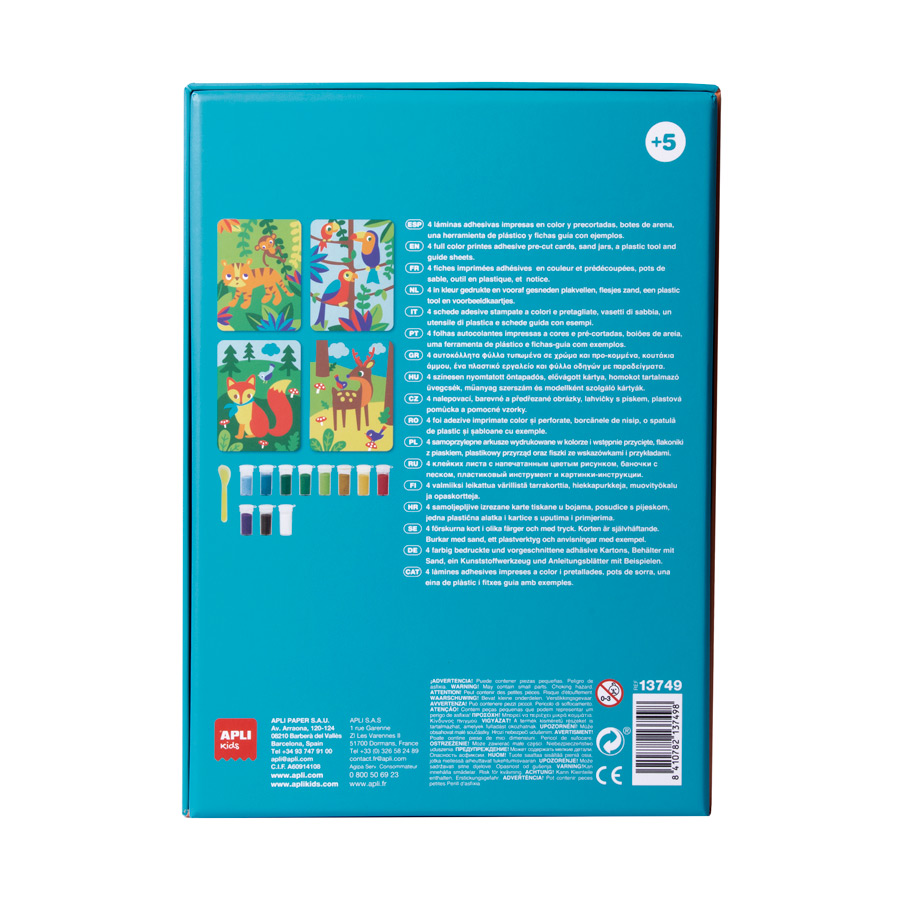 Kleuren zonder potloden, maar met gekleurd zand. Gemakkelijk en leuk: Je hoeft alleen maar het zelfklevende deel bloot te leggen (met het bijgeleverde gereedschap) en het gekleurde zand uit te spreiden om de ontwerpen te kleuren. Een APLI Kids exclusief ontwerp, kleurrijk en origineel. Elke verpakking bevat al het materiaal dat nodig is om 4 tekeningen te maken: 4 kaarten met de ontwerpen in kleur gedrukt, 11 verschillende kleuren zand en een plastic tool. Gemakkelijk te gebruiken: de bedrukte kleefkaarten hebben geen extra kleefstof nodig en de buisjes met zand zijn voorzien van een doseerdop voor meer precisie.