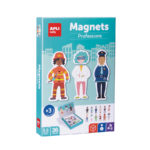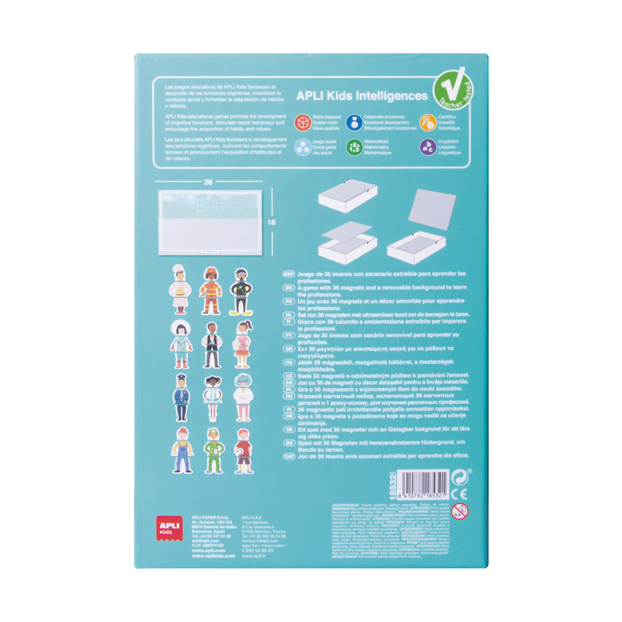 Beroepen en hun kleding staan centraal in dit magneetspel. Laat kinderen kennis maken met beroepen en hun uiterlijk, met 12 verschillende beroepen en 36 magneetjes met kledingstukken. Bevestig de magneetjes op het juiste poppetje op het bijgeleverde magneetbord en creëer het juist uniform van een politieagent, brandweerman etc. etc.. Een exclusief APLI Kids ontwerp met originele en kleurrijke illustraties.