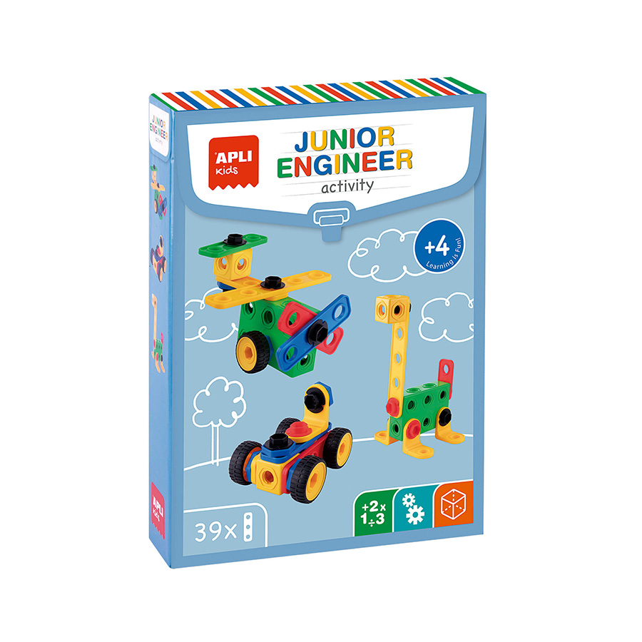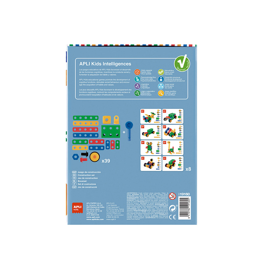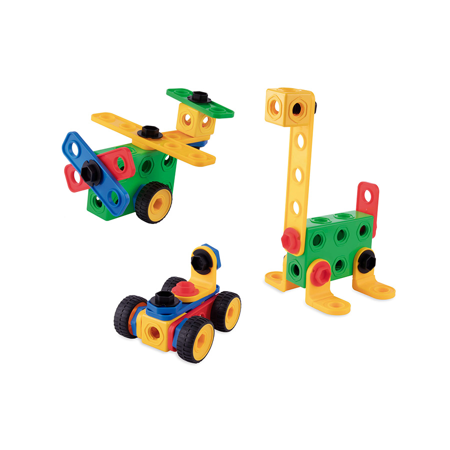 Het spel bevat een gereedschap voor het vast- en losdraaien van bouten en moeren en 8 bladen met voorbeelden om hun vaardigheden en fantasie te ontwikkelen.