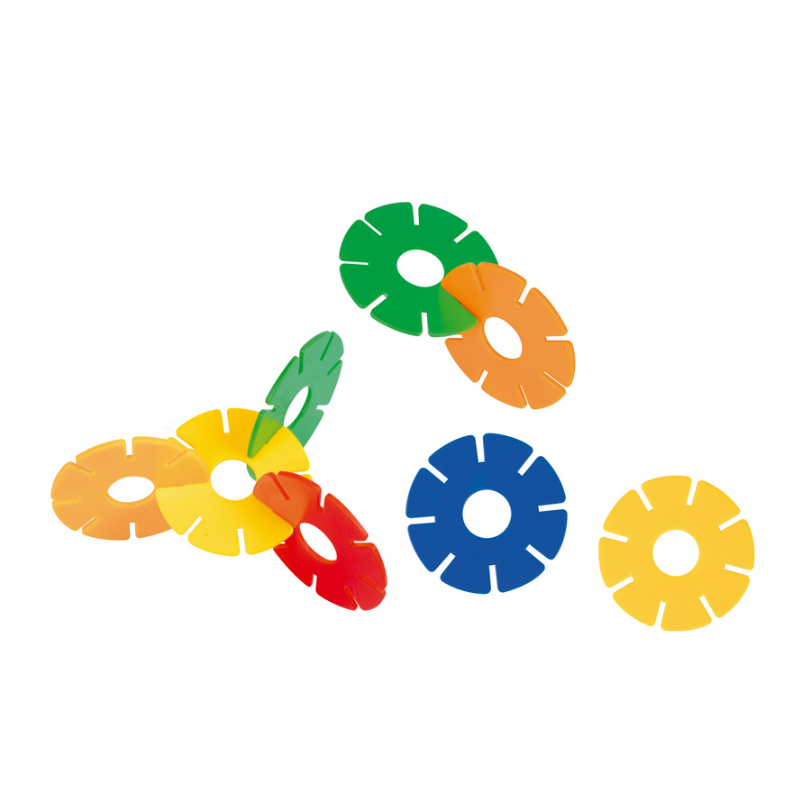 Een handige box met 60 ronde didactische schijven voor het bouwen door het in elkaar passen, waardoor 3D-vormen ontstaan. De schijven in de kleuren rood, geel, groen, blauw en oranje zijn Ø 77 mm.
