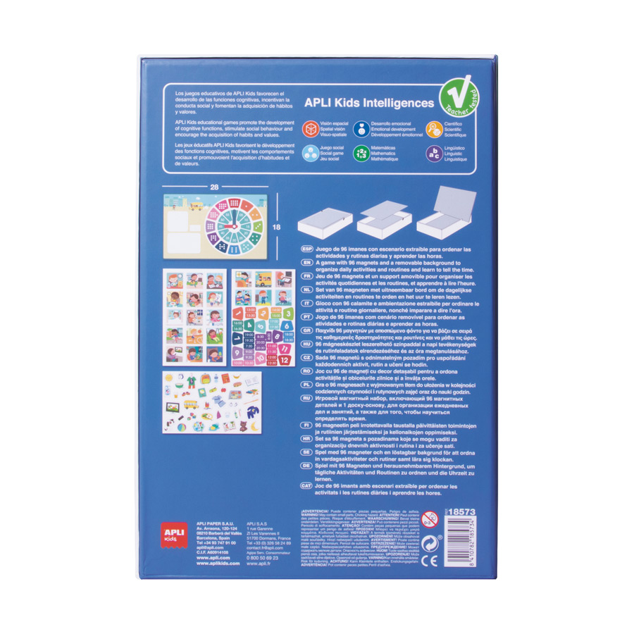 Leer klokkijken met dit APLI Kids magneetspel. Zowel analoog als digitale tijdweergave en kaarten met dagelijkse bezigheden vind je in dit educatieve spel. Op een magneetbord geef je de tijd en zijn bezigheid weet doormiddel van de 96 bijgeleverde magneetjes. Een exclusief APLI Kids ontwerp met originele en kleurrijke illustraties.