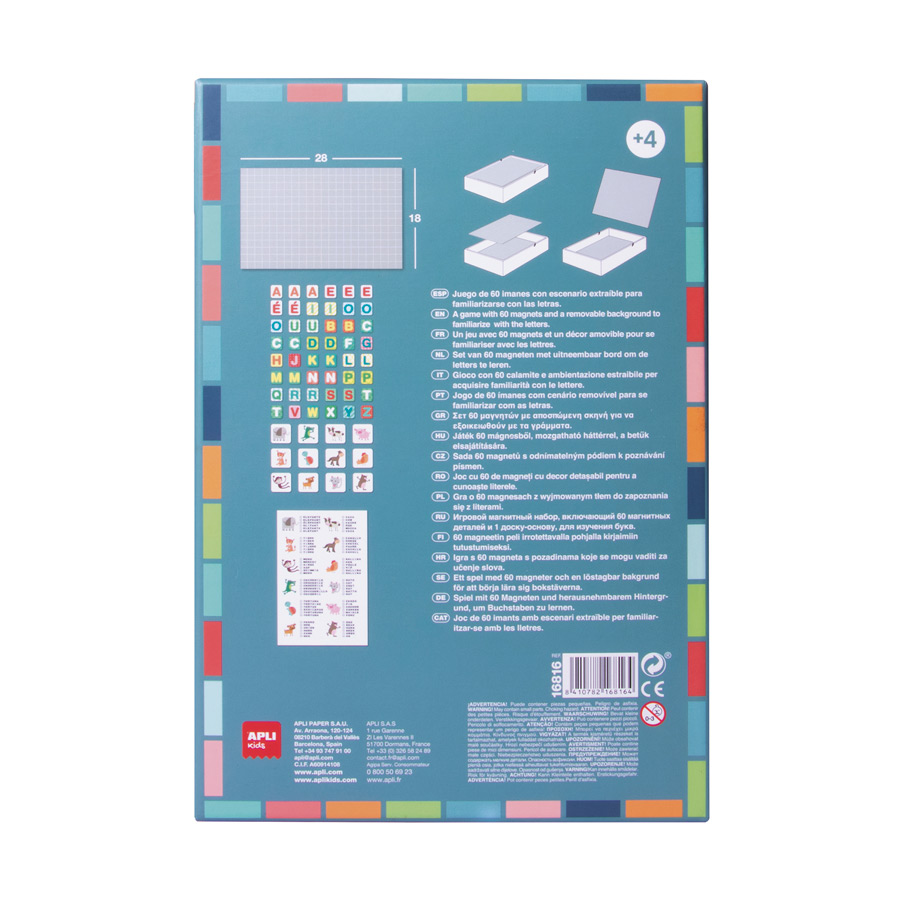 Magnetisch spel met het alfabet. Leer met de letter je naam of die van verschillende dieren te schrijven en je eigen woorden te maken met magnetische letters. Elk spel bevat: 1 magnetisch podium van 28 x 18 cm dat op de bodem van de doos past, 48 magneten met letters, 12 magneten met dieren en een gids met de namen van de dieren van het spel in 6 verschillende talen. Een exclusief APLI Kids ontwerp met originele en kleurrijke illustraties.