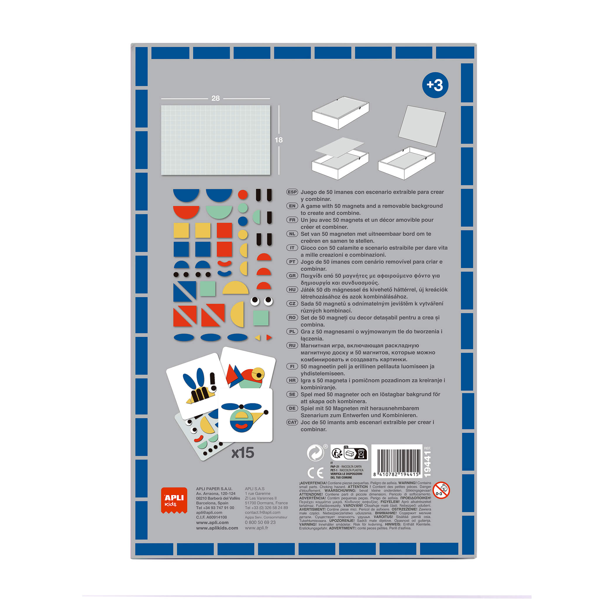 Elke set bevat: 1 magneetpodium van 28 x 18 cm dat op de bodem van de doos past, 50 vormmagneten en 15 kaarten met voorbeelden. Een spel met een hoge educatieve waarde: het stimuleert observatie en verbeelding; verhoogt de concentratie en aandacht; en wekt interesse op in onbekende vormen.