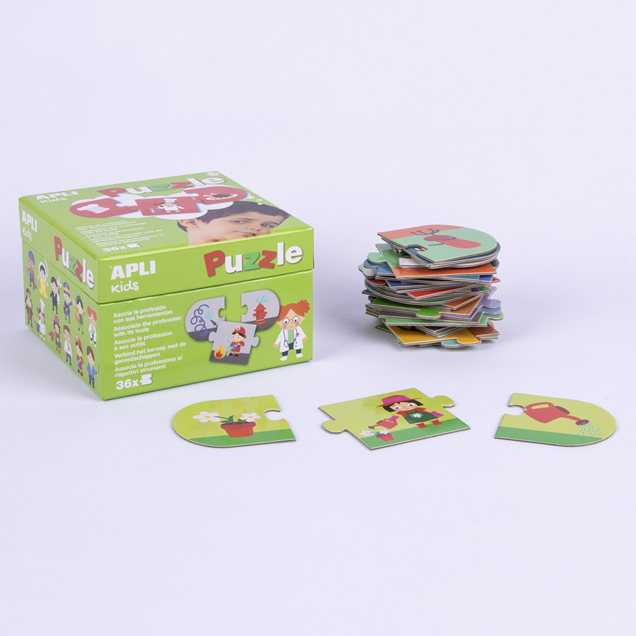Een APLI Kids puzzel, met beroepen en hun bijbehorend gereedschap. Ideaal om kinderen verschillende beroepen te leren en wat er nodig is om ze uit te oefenen. Het spel bevat 36 stukken met de afmeting 7 x 7 cm, met een totaal van 12 combinaties gevormd door 3 stukken. Stevige puzzelstukken, veilig en gemakkelijk te hanteren, in 2 mm dik karton met een glanzende afwerking en Indiana op de rug.