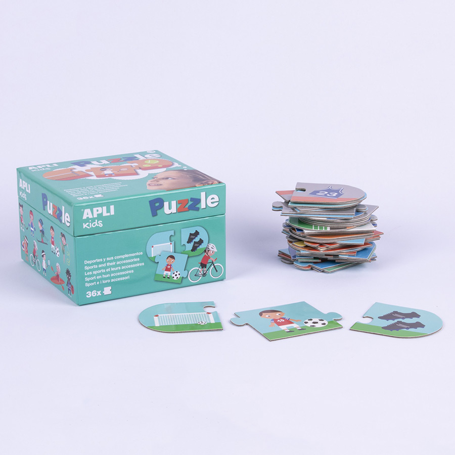 Een APLI Kids puzzel, voor het leren van sporten en hun attributen. Leer kinderen over de spullen die nodig zijn bij het beoefenen van de sport. Het spel bevat 36 stukken met de afmeting 7 x 7 cm, met een totaal van 12 combinaties gevormd door 3 stukken. Stevige puzzelstukken, veilig en gemakkelijk te hanteren, in 2 mm dik karton met een glanzende afwerking en Indiana op de rug.