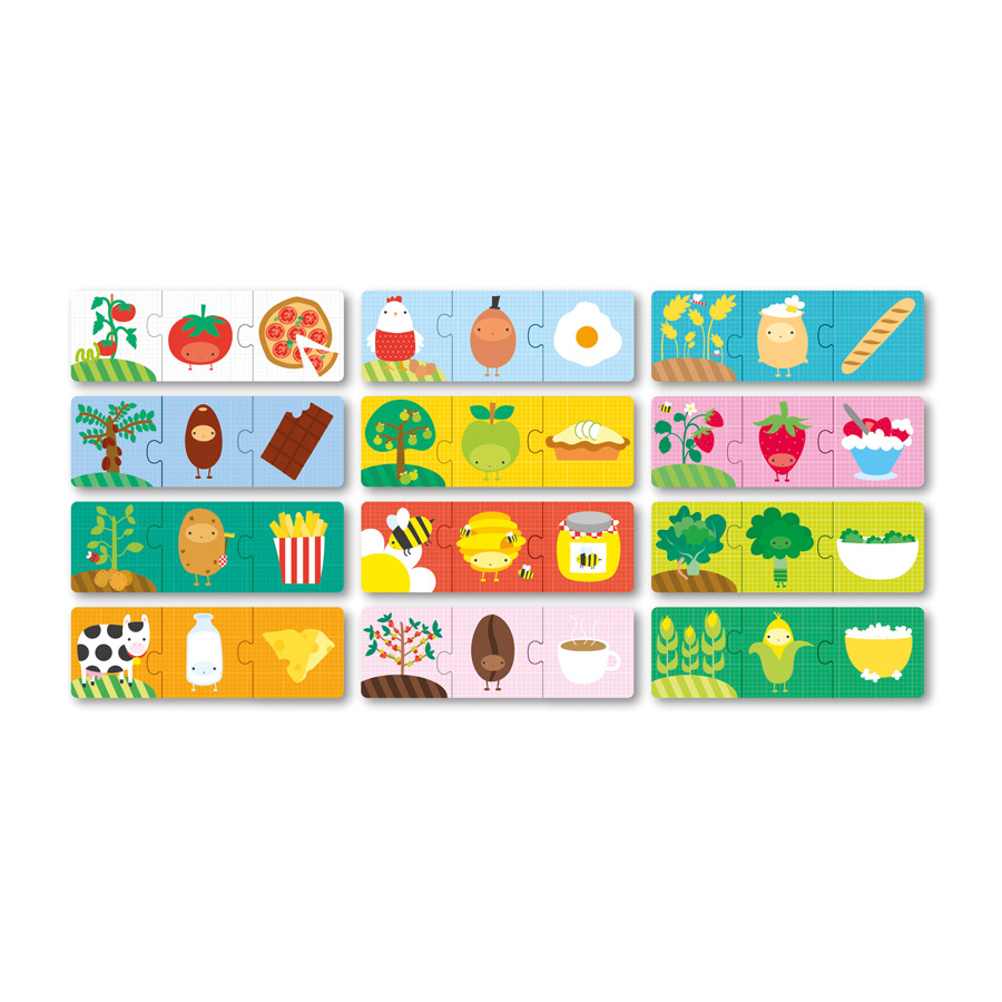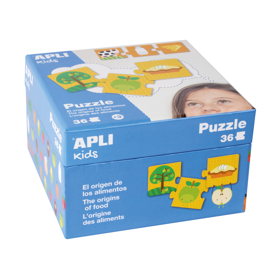 Een APLI Kids puzzel, die ze leert over de oorsprong van voedsel. Leer kinderen waar het meest voorkomende voedsel dat ze eten vandaan komt, de appels van de appeltaart, het melk voor de kaas….. Het spel bevat 36 stukken met de afmeting 7 x 7 cm, met een totaal van 12 combinaties gevormd door 3 stukken. Stevige puzzelstukken, veilig en gemakkelijk te hanteren, in 2 mm dik karton met een glanzende afwerking en Indiana op de rug.