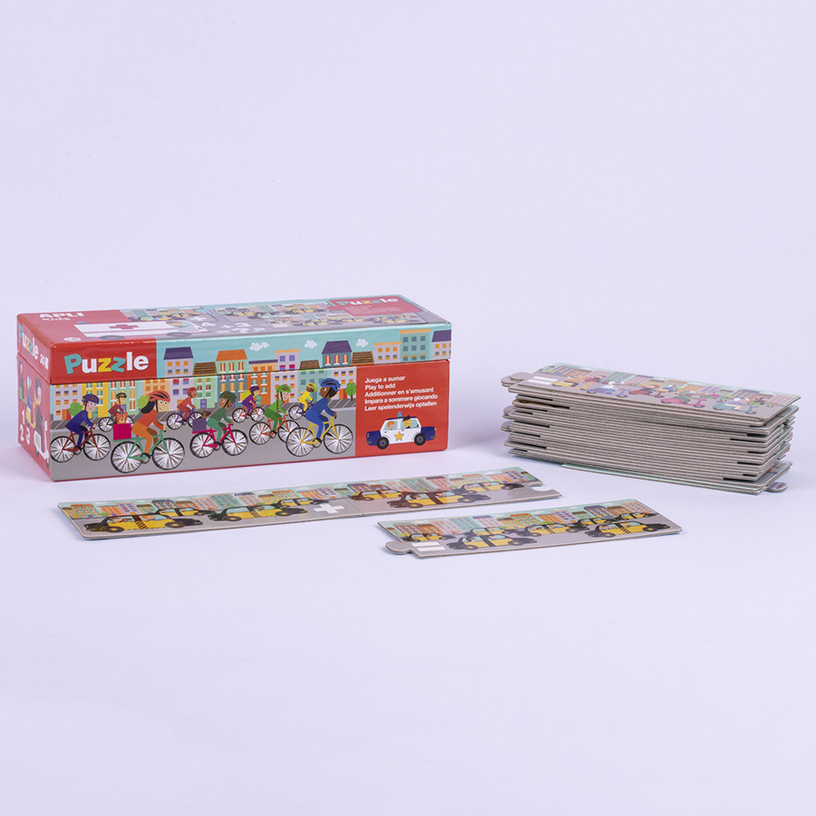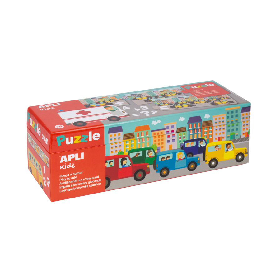 Rekenpuzzel om vertrouwd te raken met getallen en sommen. Leer tellen door te spelen, tel de voertuigen en zoeken naar de puzzelstukjes die de bijbehorende sommen bevatten.. Elke puzzel bevat 30 stukjes, in totaal 10 verschillende reeksen (elk 49 x 7 cm). De stukjes zijn stevig, veilig en gemakkelijk te hanteren en ze passen perfect in elkaar om het in elkaar zetten te vergemakkelijken. Een originele en didactische puzzel, die de kinderen helpt bij het optellen, door het tellen van de voertuigen in de puzzel, ontwikkelt fijne motorische vaardigheden en verbetert de concentratie.