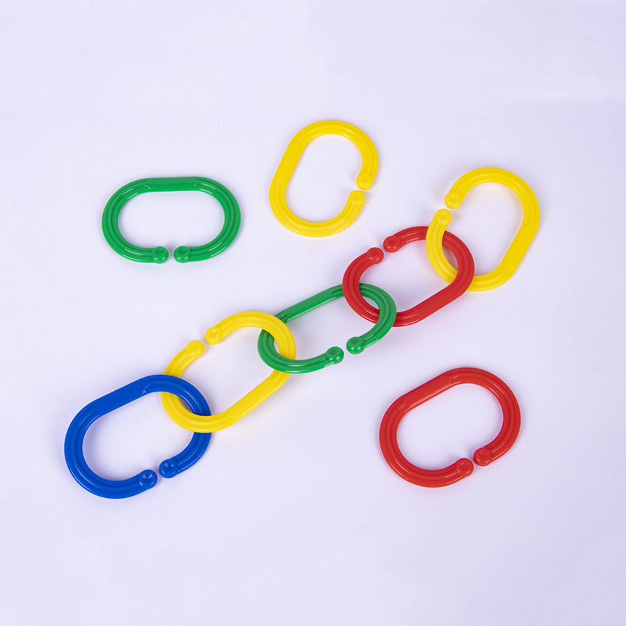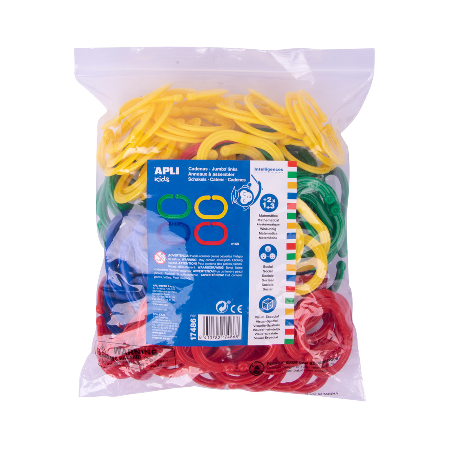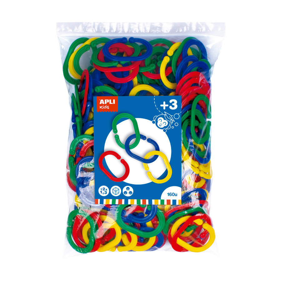 Schakelringen van APLI Kids. Maak de gekleurde ringen aan elkaar vast, in een kleurpatroon of gewoon willekeurig. Schakelringen verbeteren de fijne motoriek, kleur herkenning en de oog-hand coördinatie.
