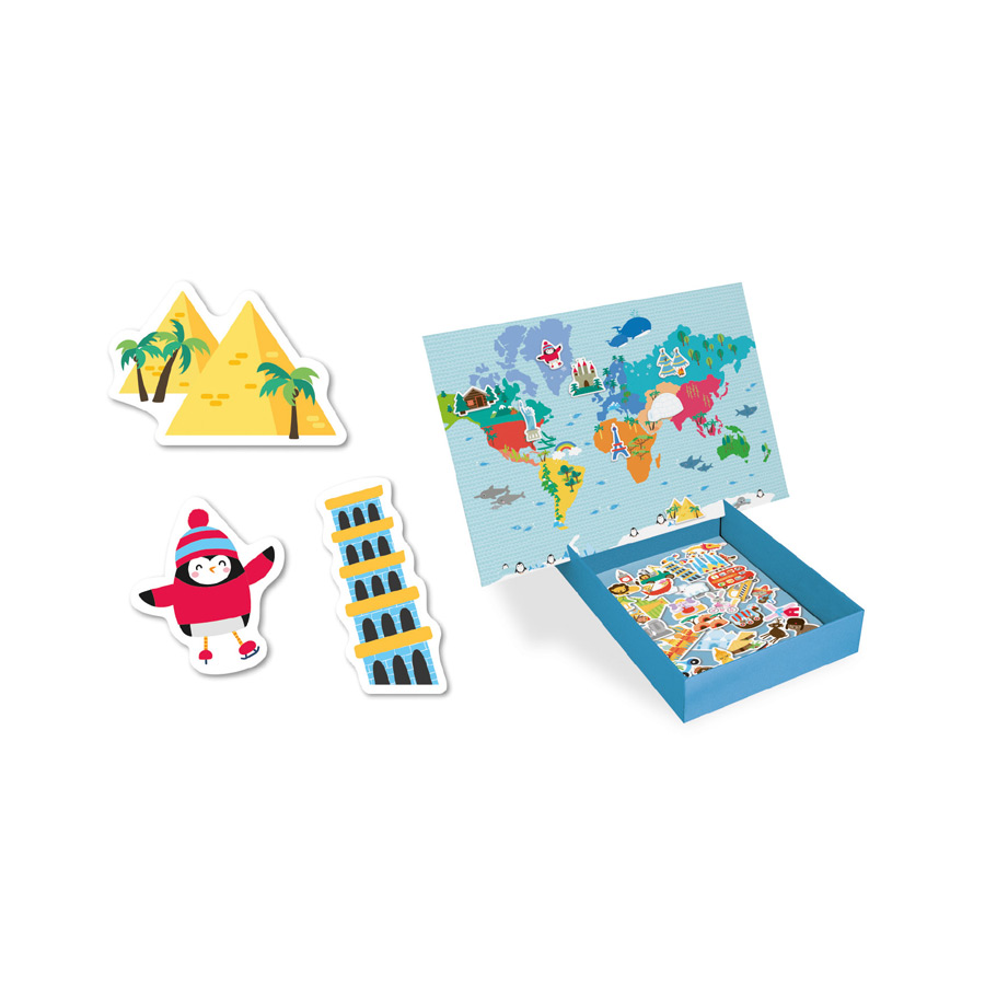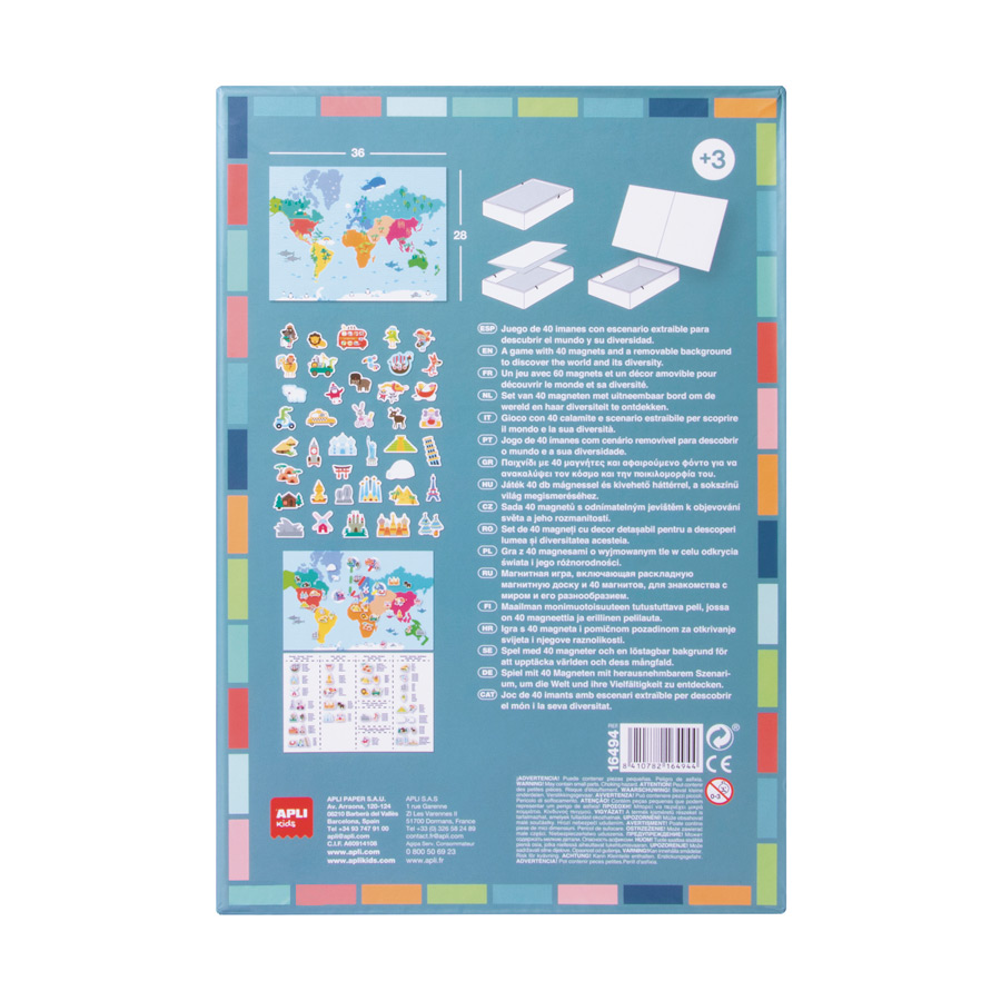 Ga op wereldreis met dit APLI Kids magneetspel. Leer welke werelddelen er zijn, bekijk hun bezienswaardigheden en leer over de dieren die er leven. Een exclusief APLI Kids ontwerp met 40 originele en kleurrijke magneetjes.