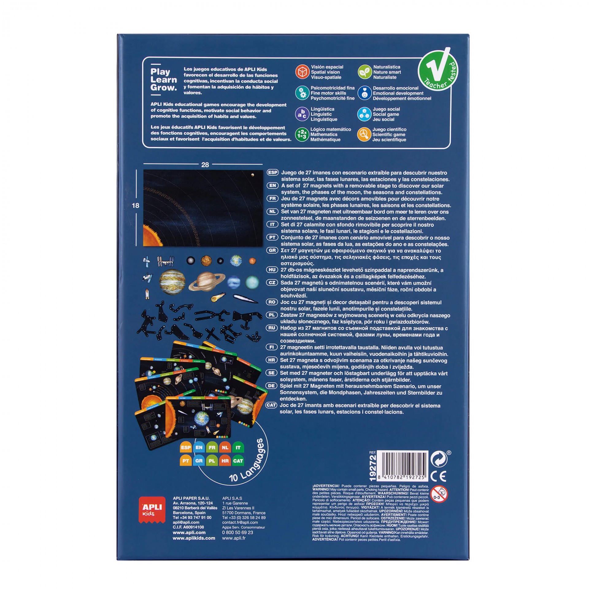 Elke set bevat: 1 magnetisch podium van 28 x 18 cm dat in de bodem van de doos past, 27 magneten en 7 kaarten met gedetailleerde informatie in 10 verschillende talen.