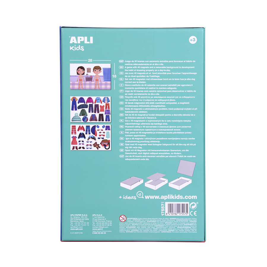 Leren kledingstukken herkennen en aankleden doormiddel van dit APLI Kids aankleed magneetspel. Creëer diverse outfits voor jongens en meisjes, 40 verschillende magneetjes met kledingstukken, laat hun fantasie de vrije loop. Een exclusief APLI Kids ontwerp met originele en kleurrijke illustraties.