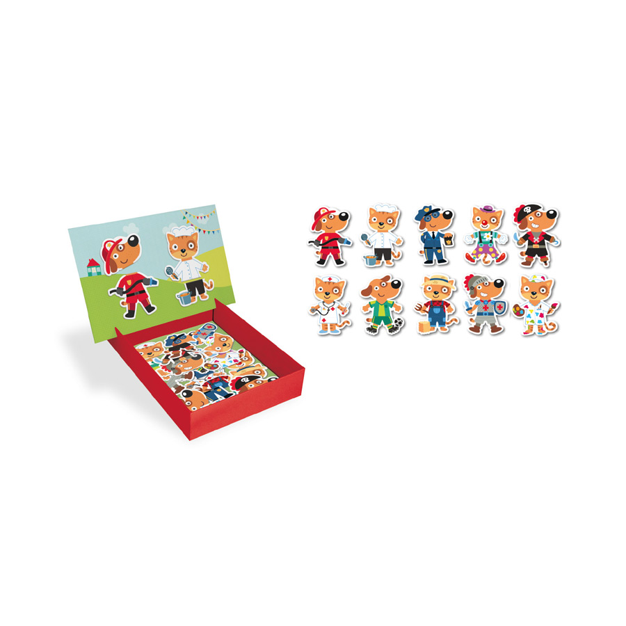 Dieren in het juiste uniform staat centraal in dit magneetspel. Ontdek het beroep van elk dier of maak oneindig veel nieuwe composities! Bevestig de 30 verschillende magneetjes op het juiste poppetje op het bijgeleverde magneetbord en creëer de juiste combinaties. Een exclusief APLI Kids ontwerp met originele en kleurrijke illustraties.