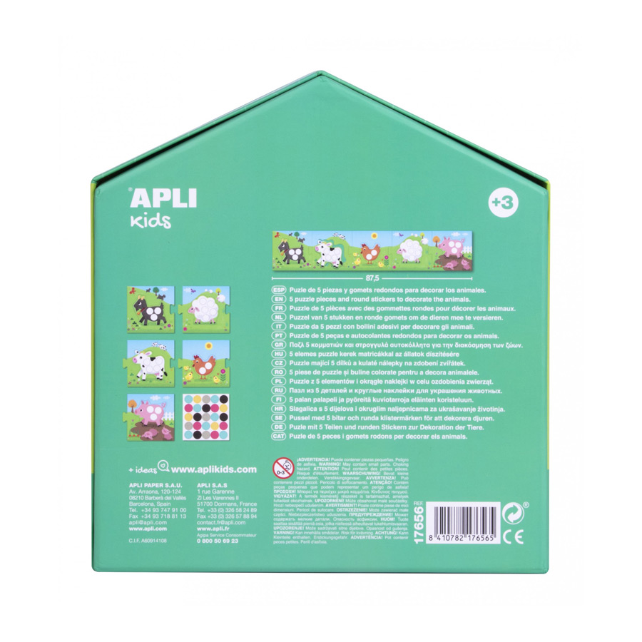 Mijn eerste puzzel van 5 XXL puzzelstukken, met 1 cirkelvormig educatief stickervel om de verschillende dieren in te kleuren. De dieren van de puzzel zijn los te maken zodat de kinderen ze als sjabloon kunnen gebruiken. Puzzelstukken zijn 17,5 x 17, 5 cm en vormen een puzzel van 87,5 x 17,5 cm. De ideale puzzel voor de jongste kinderen dankzij de grootte van de stukken en de gebruikte materialen. Deze leuke puzzel helpt kinderen om hun fijne motoriek en concentratie te verbeteren.
