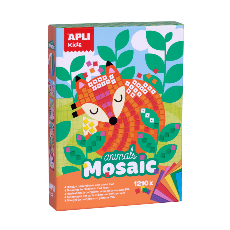 Mozaïek spel met dieren. Voltooi de tekeningen op de kaarten met EVA kleefschuim voor een spectaculaire afwerking. Een verpakking bevat een gids, 6 vellen zelfklevend EVA-schuim, voorgesneden en in verschillende kleuren, en 2 kaarten met een hoog grams gewicht, bedrukt in kleur en met verschillende motieven bijv. uil en egel. De kartonnen kaarten hebben lege ruimtes met gekleurde stippen als leidraad voor het invullen met EVA-schuim in de juiste kleur.
