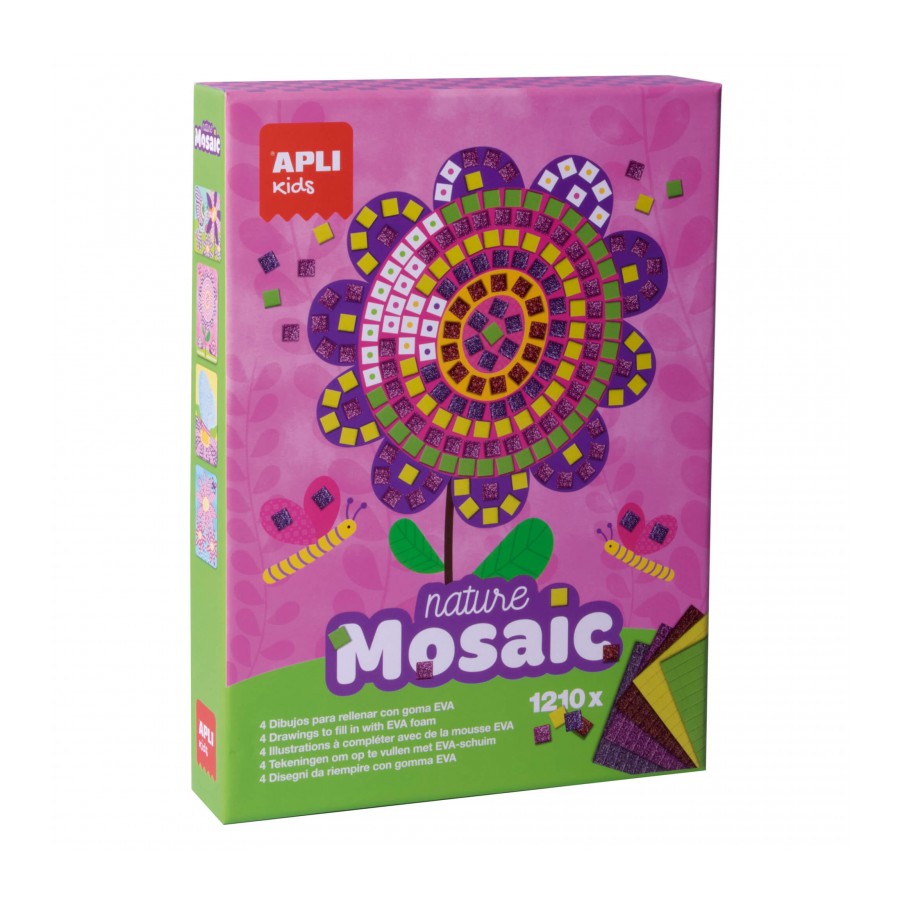 Mozïek spel over de lente, met zelfklevend EVA foam voorgesneden in verschillende kleuren en afwerkingen. Het spel bestaat uit het voltooien van de tekeningen op de kaarten met EVA zelfklevend schuim voor een spectaculaire afwerking. De verpakking bevat een gids, 8 vellen zelfklevend EVA-schuim, voorgesneden en in verschillende kleuren, en 2 kaarten met een hoog grams gewicht, bedrukt in kleur en met verschillende dessins o.a. vlinder en bloem. De kartonnen kaarten hebben lege ruimtes met gekleurde stippen als leidraad voor het invullen met EVA-schuim in de juiste kleur.