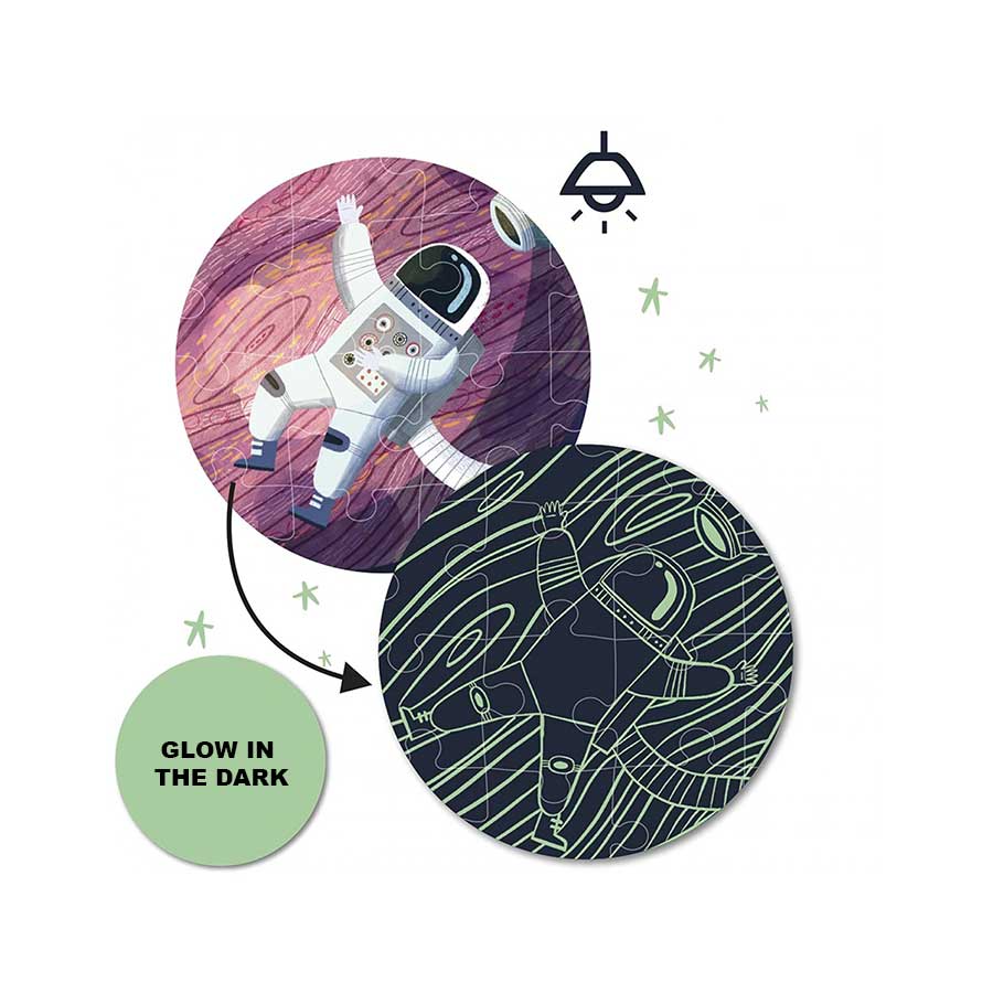 Belangrijk: om het gloei-effect “op te laden” moet de puzzel minstens 30 minuten onder een lichtbron worden gelegd. Doe daarna het licht uit om de magie te zien!
