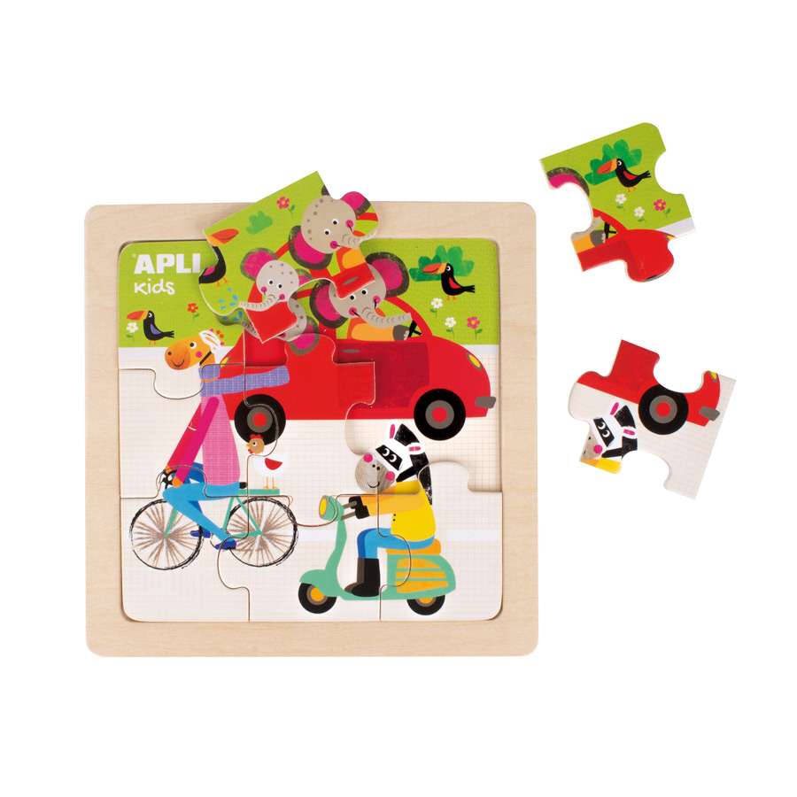 Houten legpuzzel 15 x 15 cm met thema verkeer voor kinderen. De puzzel is gedrukt in kleur en bevat een gedrukte achtergrond om het puzzelen te vergemakkelijken.