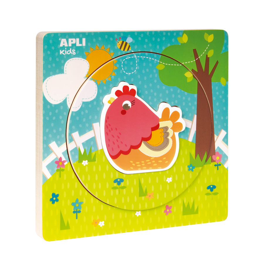 Houten lagen puzzel met 3 verschillende lagen waarin de cirkels van het leven wordt weergegeven. De vierde en laatste laag is een houten stuk met de vorm van een kip, zodat het kind ermee kan spelen. Deze APLI Kids puzzel is full-color bedrukt, met als doel van het spel elke vorm, te identificeren, in de juiste volgende te leggen en in elkaar te passen. Een puzzel met een hoge didactische waarde, het oefeninen met duim en wijsvinger, onderscheiden leren maken van vormen en het ontwikkelen van logica en visueel-ruimtelijke vaardigheden.