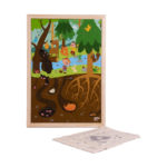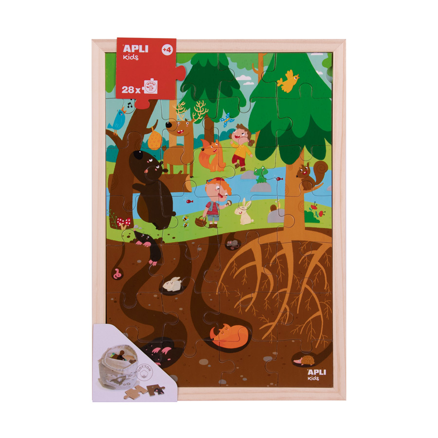 Ontdek met deze puzzel wat er onder en boven de grond gebeurd in het bos. Kinderlijk, kleurrijk, helder en eenvoudige APLI Kids puzzel met houten frame en houten puzzelstukken.