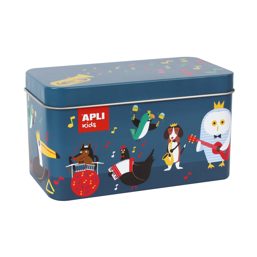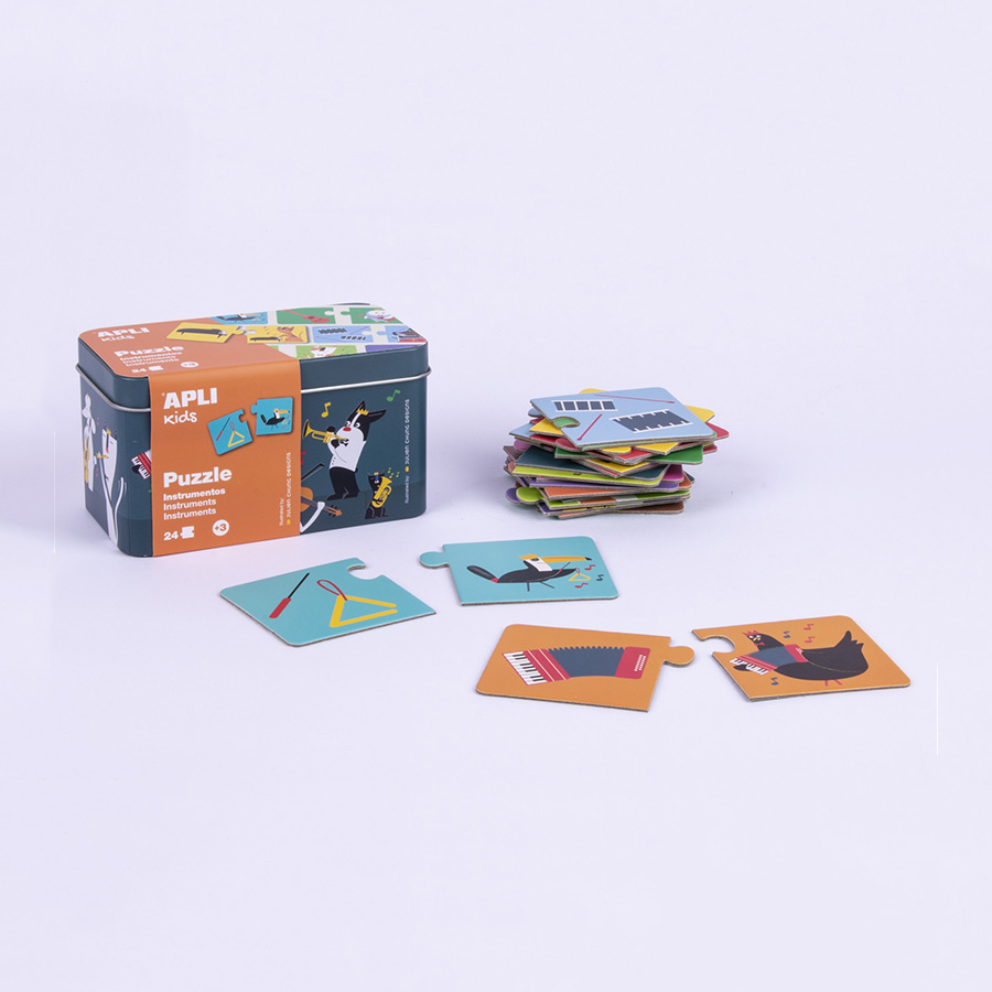 Puzzel met muziekinstrumenten, associatiepuzzel van APLI Kids waarbij kinderen elk stukje puzzel in verband moeten brengen met het puzzel van het instrument dat bespeeld word. Een product met een originele presentatie en een aantrekkelijk design in een rechthoekige kleurrijke metalen doos, ook handig om kinderspullen in op te bergen.