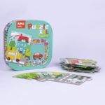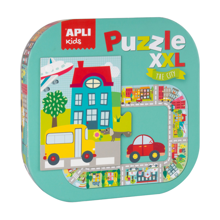 XXL-puzzel van APLI Kids over het leven in de stad. De puzzel bestaat uit 12 stukken van 18,8 cm hoog en zo kan een schakeling worden gemaakt met een als het ware een voetpad door de stad (formaat 158 x 53 cm). Een puzzel die dubbel zoveel plezier biedt, pas de puzzelstukken in elkaar om de stad te ontdekken, mee te spelen en verzin zo leuke verhalen.