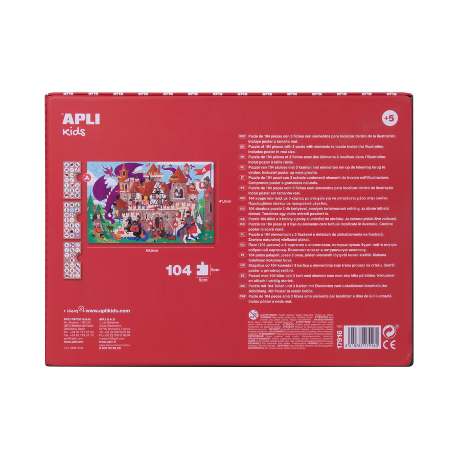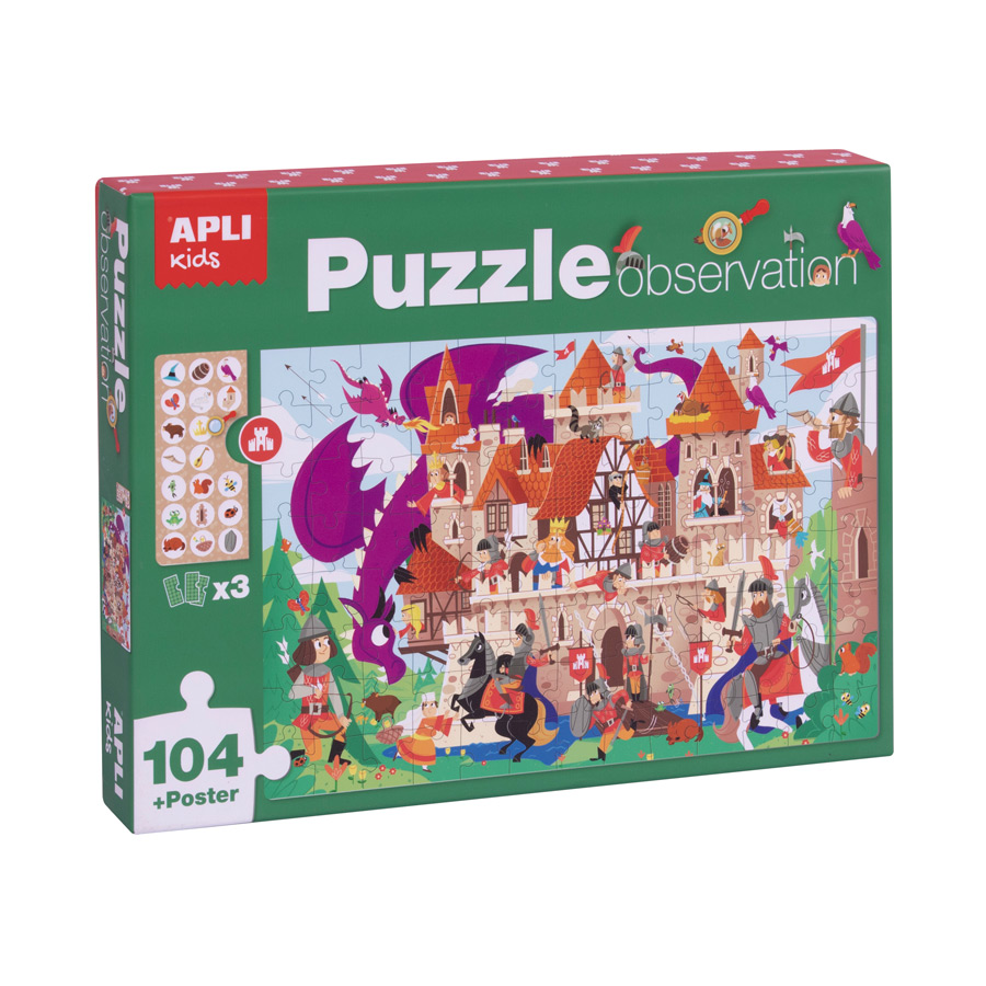 Zoek en vind de voorwerpen in het kasteel en leer tegelijk dingen benoemen. Maak de puzzel met behulp van de bijgeleverde poster en zoek dan de mensen en voorwerpen die op de 3 te koppelen kaarten staan. Kinderlijk, kleurrijk, duidelijk en eenvoudig spel, een ideaal cadeau voor kinderen ontworpen door APLI Kids.