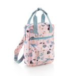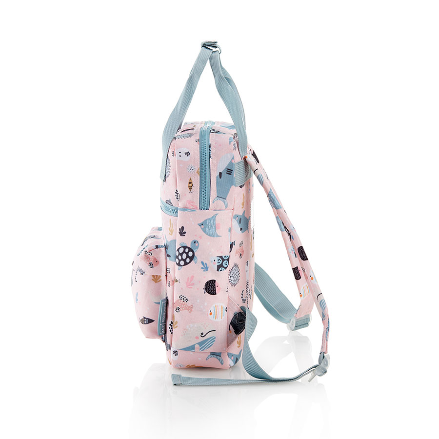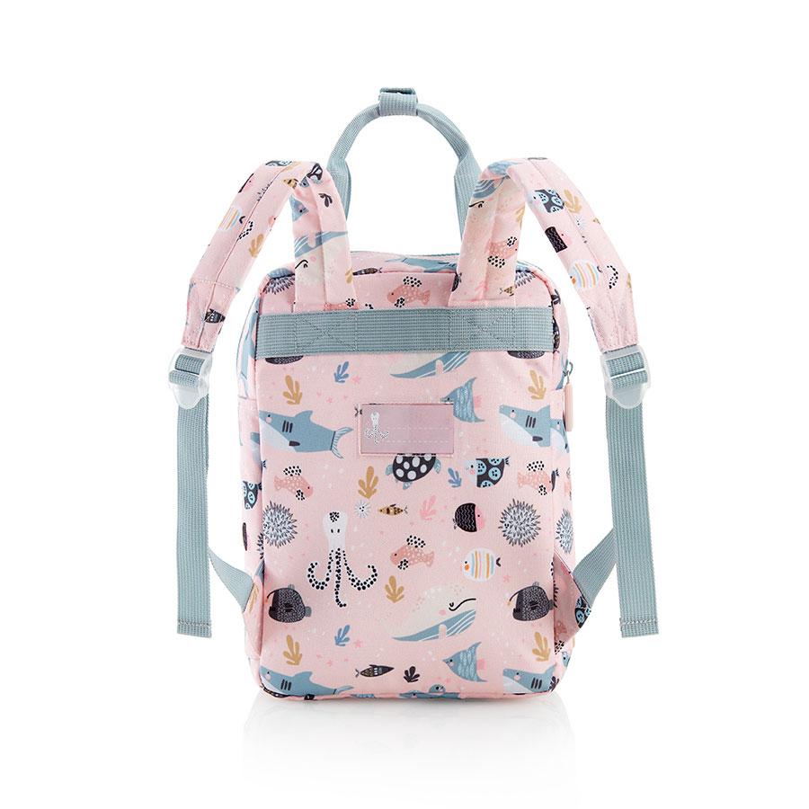 Rugzak met zeedieren erop in de kleur roze. Voorzien van verstelbare hengsels, sluiting op de borst, een ritsluiting en naamhouder.