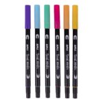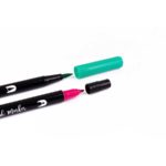 6 pastel gekleurde dubbelzijdige stiften met inkt op waterbasis. Twin tip stiften om vorm en kleur te geven aan uw ontwerpen en artistieke creaties. Aan één kant een nylon tip penseel type 1-4 mm, zacht en flexibel waarmee u fijne en dikke streken met groot gemak kunt combineren. Aan de andere kant een bullet tip 1 mm precisie voor het profileren. De inkt is aquarel, reukloos en niet giftig. Het bevat 6 kleuren: pastel geel, pastel blauw, pastel paars, pastel oranje, pastel roze, pastel groen
