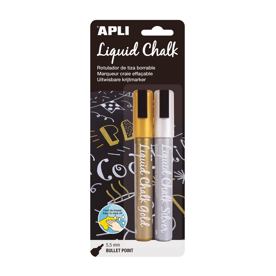 Verpakking met 2 vloeibare krijtstiften met een ronde 5,5 mm punt in de kleuren zilver en goud. Ideaal om te schrijven op schoolborden, plastic, ramen, leisteenetiketten, glanzende borden, spiegels, keramiek, vinyl, metaal, enz. Gemakkelijk te wissen met een vochtige doek op niet-poreuze oppervlakken. Praktisch en gemakkelijk te gebruiken in uw bedrijf, kantoor, thuis of op school. Snelle droging voor een meer precieze en professionele afwerking. Eenvoudig te gebruiken: Schudden, openen en gebruiken. Markeerstift op waterbasis, vrij van giftige elementen.