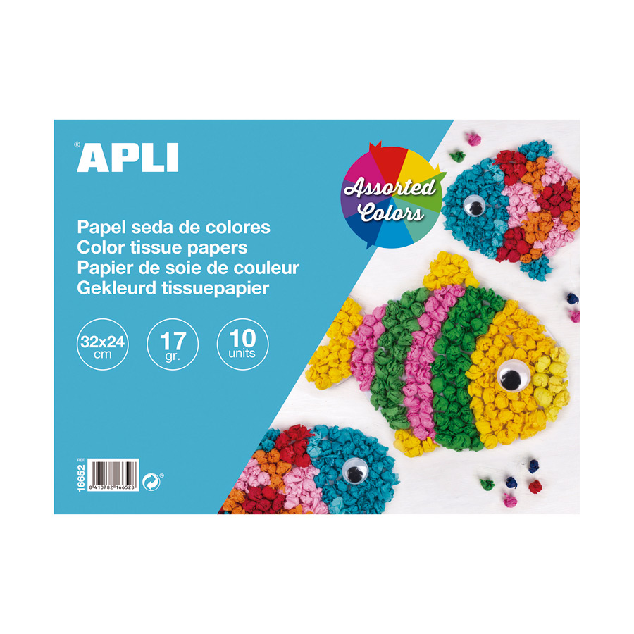 Tissue gekleurd papier , 17 g/m² formaat 32 x 24 cm. Verpakking bevat 10 vellen in verschillende kleuren (1 vel per kleur): geel, oranje, rood, blauw, roze, marineblauw, groen, bruin, zwart en wit. Ideaal voor allerlei soorten handwerk, scrapbooking, omslagen, scheiders, origami, enz.
