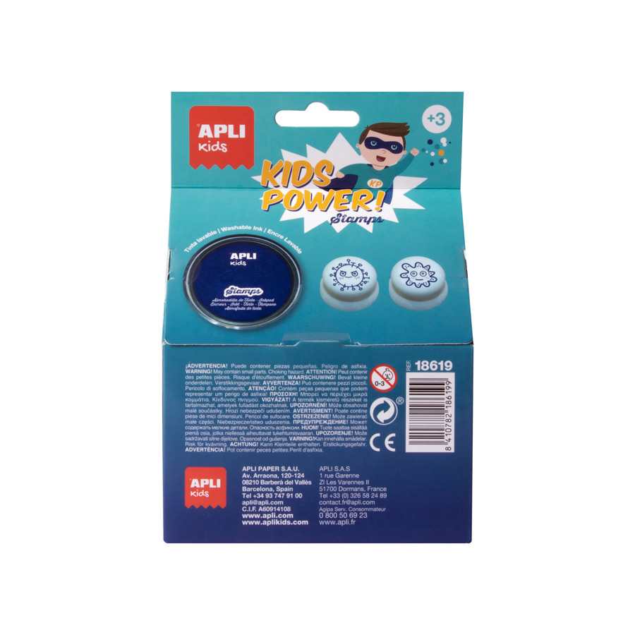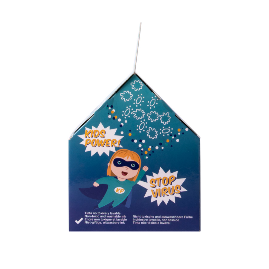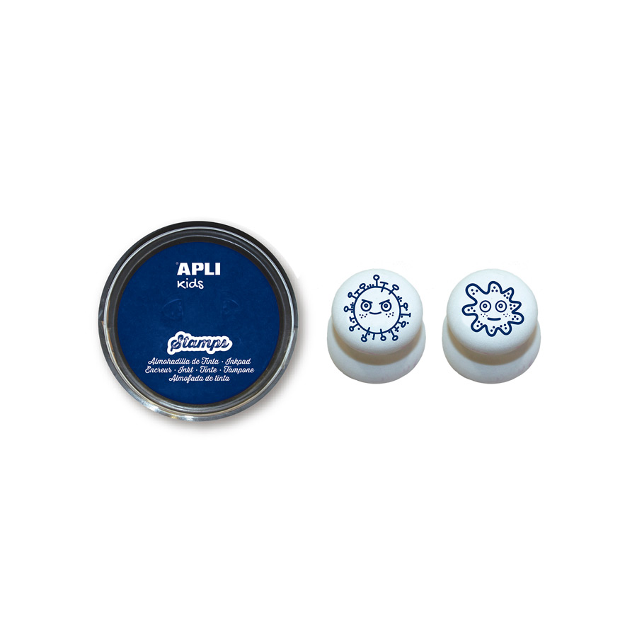 Set van rubberen stempels met virusmotieven en een blauw stempelkussen. Elke set bevat 2 ergonomische stempels met virusiconen en een blauw stempelkussen. Vooral bedacht om kinderen aan te moedigen hun handen vaak te wassen, met als hoofddoel het ontwerp van hun handen te laten verdwijnen. Kinderen moeten ’s morgens op elke hand een stempel zetten en na het veelvuldig wassen van hun handen gedurende de dag zullen ze controleren hoe de virustekeningen verdwijnen. Ergonomisch ontwerp dat het vasthouden vergemakkelijkt en het uitglijden bij het stempelen voorkomt, speciaal ontworpen voor kinderen. Niet-giftige inkt, gemakkelijk wasbaar van huid en kleding.