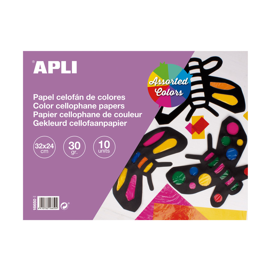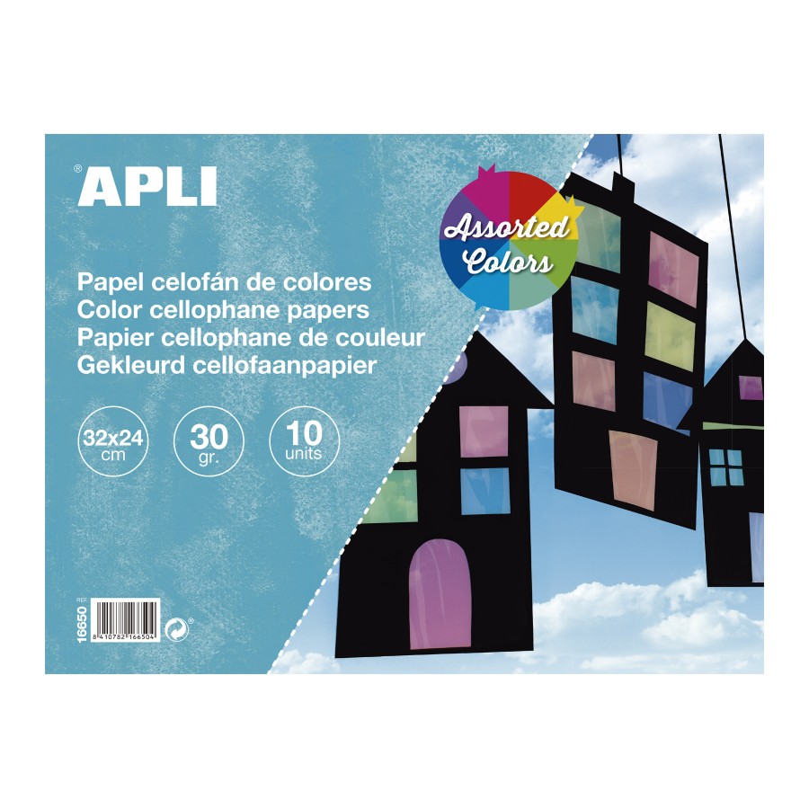 Cellofaanpapier transparant papier, 30 g/m² formaat 32 x 24 cm. Verpakking bevat 10 vellen in verschillende kleuren: Geel (1 vel), transparant (2 vel), oranje (1 vel), roze (1 vel), rood (2 vel), blauw (2 vel) en groen (1 vel). Ideaal voor allerlei soorten handwerk, scrapbooking, omslagen, scheiders, origami, enz.